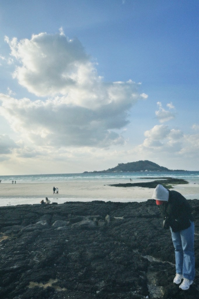 Unser erster Stopp war Hyeopjae-ri, ein Strand, der für sein klares blaues Wasser bekannt ist. Als wir angekommen sind, haben wir erstmal einfach nur aufs Meer geschaut. Diese Momente, in denen man nichts macht außer die Landschaft zu genießen, sind für mich oft die schönsten auf Reisen.